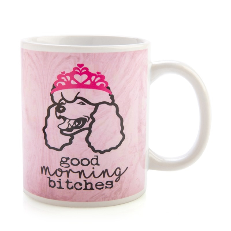 Quality ceramic mug featuring a sassy tiara-wearing poodle and punny phrase "Good Morning B*tches!"